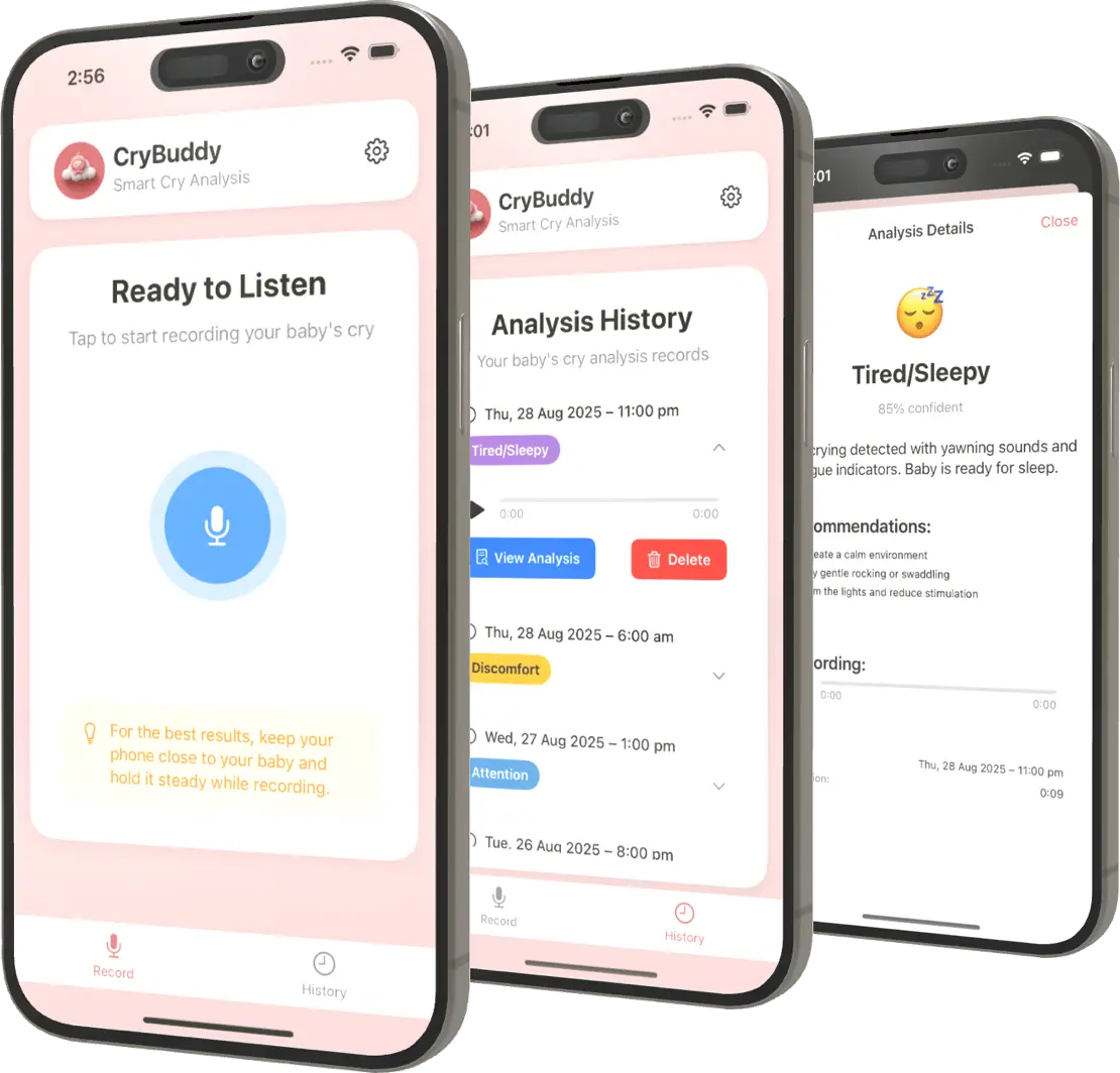 Cry Buddy uses advanced artificial intelligence to analyze your baby's cries and provide instant insights into what they need.